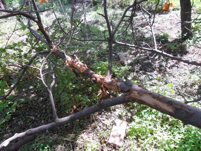 столовые нашего дачного дятла. Если на ветке он добывал жучков-короедов, то на второй фотографии -- наковальня. Птица намеренно выдолбила подходящую ложбинку в дереве, что бы потом вставлять в неё орешки фундука (там ещё осталась оболочка одного из них) и попировать со всеми удобствами. Так же дятел поступает и с шишками и другими орехами.