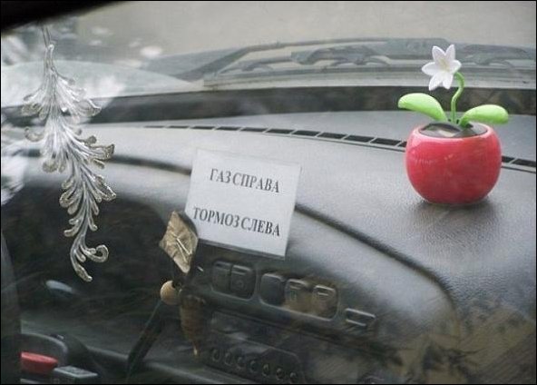 А мне понравилась записочка на машине. Только ее надо бы было еще и графически разделить на право и лево, чтобы уж совсем сомнений не оставалось... У нас недавно 70-летний водитель насмерть задавил пенсионерку перед поликлиникой, потому что педали перепутал.