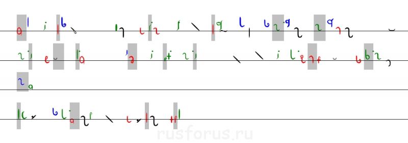 Я сравнил нотограмму с буквенным текстом и расставил ударения, написав ударную гласную, как она обозначена в нотограмме заглавной буквой.