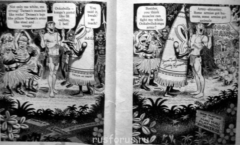 Лев.Стр.: Not only me white, me strong! T*rz*n's muscles like rocks! T*rz*n's legs like pillars T*rz*n's arms like steel and... woops! # Ookabolla - konga's pistol like 38 calibre, I bet! # You said it, bwah! So reach!