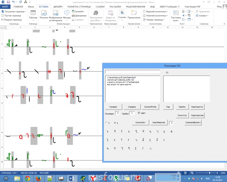 режим 3 и 5 линейки переключается радиокнопками "3" и "5". по умолчанию 3линейка. Кнопка "InsertBasLines" вставляет в документ базовые (строчные) линии (количество линий задаётся в окошке справа). потом эти строчные линии надо вручную подгонять под строки фонок.