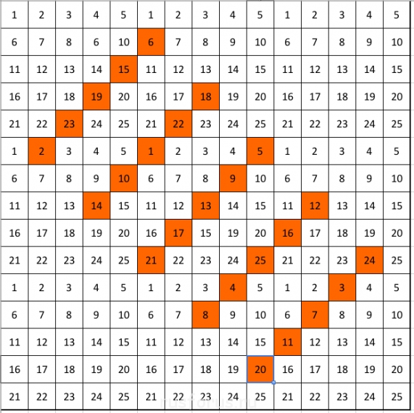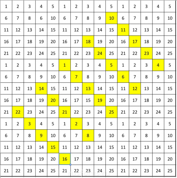 Нужно выделить кружочками такие 25 разных чисел, чтобы полученная решетка образовала супермагический квадрат (СК), у которого сумма чисел по любой строке, по любому столбцу, по главным диагоналям и по любой ломаной диагонали была одной и той же (S1). Более того, в этом СК любые пары центрально противоположных чисел, тоже должны быть равны некоторому числу (S2). Мне потребовалась ровно неделя, чтобы закричать: "Эврика!"