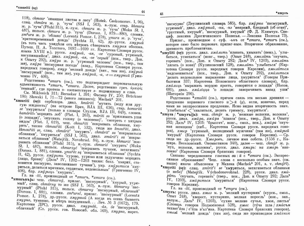 ХМУРЫЙ — происходит от формы, родственной русск. хмы́ра «мрачный человек», укр., белор. хму́ра, чешск. chmoura «туча», словацк. chmúra, польск. chmura, в.-луж. khmura, н.-луж. chmura. Также родственно сму́рый «темный», па́смурный.