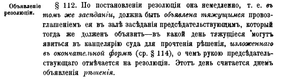 "По постановлении резолюции она немедленно, т.е. в том же заседании, должна быть объявлена тяжущимся провозглашением ... "