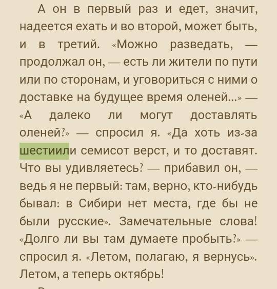 Источник: http://goncharov.lit-info.ru/goncharov/ ... da-2-8.htm«Да хоть из-за шести- или семисот верст, и то доставят. Что вы удивляетесь? — прибавил он, — ведь я не первый: там, верно, кто-нибудь бывал: в Сибири нет места, где бы не были русские». Замечательные слова!