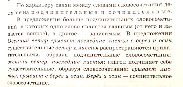 <…> После работ В.В. Виноградова широкое распространение получило мнение, согласно которому к словосочетаниям относятся только непридикативные сочетания с подчинительной связью. Однако существует и другое мнение, согласно которому словосочетаниями являются не только подчинительные, но и сочинительные сочетания слов.