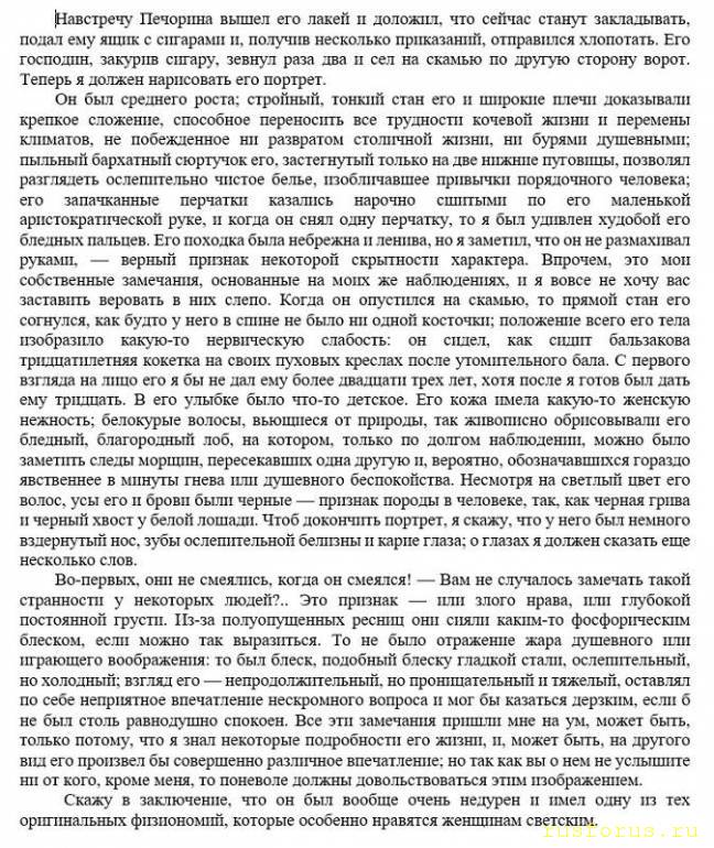 Он был среднего роста; стройный, тонкий стан его и широкие плечи доказывали крепкое сложение, способное переносить все трудности кочевой жизни и перемены климатов, не побежденное ни развратом столичной жизни, ни бурями душевными; пыльный бархатный сюртучок его, застегнутый только на две нижние пуговицы, позволял разглядеть ослепительно чистое белье, изобличавшее привычки порядочного человека; его запачканные перчатки казались нарочно сшитыми по его маленькой аристократической руке, и когда он снял одну перчатку, то я был удивлен худобой его бледных пальцев. Его походка была небрежна и ленива, но я заметил, что он не размахивал руками, — верный признак некоторой скрытности характера. Впрочем, это мои собственные замечания, основанные на моих же наблюдениях, и я вовсе не хочу вас заставить веровать в них слепо. Когда он опустился на скамью, то прямой стан его согнулся, как будто у него в спине не было ни одной косточки; положение всего его тела изобразило какую-то нервическую слабость: он сидел, как сидит бальзакова тридцатилетняя кокетка на своих пуховых креслах после утомительного бала. С первого взгляда на лицо его я бы не дал ему более двадцати трех лет, хотя после я готов был дать ему тридцать. В его улыбке было что-то детское. Его кожа имела какую-то женскую нежность; белокурые волосы, вьющиеся от природы, так живописно обрисовывали его бледный, благородный лоб, на котором, только по долгом наблюдении, можно было заметить следы морщин, пересекавших одна другую и, вероятно, обозначавшихся гораздо явственнее в минуты гнева или душевного беспокойства. Несмотря на светлый цвет его волос, усы его и брови были черные — признак породы в человеке, так, как черная грива и черный хвост у белой лошади. Чтоб докончить портрет, я скажу, что у него был немного вздернутый нос, зубы ослепительной белизны и карие глаза; о глазах я должен сказать еще несколько слов.