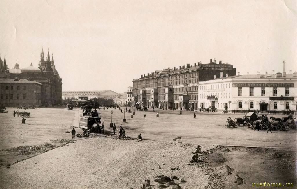 В 1868 году приказчик Гурина, И.Я. Тестов, уговорил Патрикеева, мечтавшего только о славе, отобрать у Егорова трактир и сдать ему. И вот, к великой купеческой гордости, на стене вновь отделанного, роскошного по тому времени дома появилась огромная вывеска с аршинными буквами: "Большой Патрикеевский трактир". А рядом скромно: "И.Я. Тестов". На фото ниже – трактир справа. Перед ним – бочки водовозов у Петровского фонтана (фонтан Витали). Слева мы видим здание ГИМ. (Старые фотографии и информация к ним от Алексея Дедушкина).