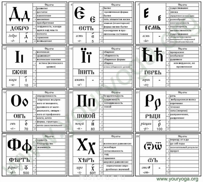 А что касается названий букв, так смысл их вовсе никакой. Во всяком случае, нет там никакого философского смысла. Было простое копирование. Финикийский алфавит, практически, как есть, ставший у греков греческим, был иероглифической скорописью. Вот, и получается, что греки взяли это письмо у финикийцев, мы — у греков, и выходит, что кириллица-то наша, «спецом» для нас созданная — ничто иное, как скорописное начертание древнеегипетских иероглифов. Но мы — не египтяне. И даже не финикийцы. Нашему уху слово «далет» ни о чём не говорит, как и «дельта», тот же «далет» в греческом произношении. А принцип-то понятен — использовать первый звук слова, обозначаемого иероглифом, в качестве фонетического знака. Но тогда было бы проще связывать буквы со словами родного языка? Так и сделали. «Д» — «добро». А что, для обучения письму детей можно было бы назвать эту букву «дерьмом»? И «п» потому же «покой», а не то, например, что пишут на заборах. Никто никаких смыслов в названия букв азбуки не вкладывал. Не надо набивать наших предков какой-то особой сверхмудростью и прочими добродетелями! При всём моём уважении к предкам я не считаю их носителями высокой, то есть, превосходящей нашу, духовности.