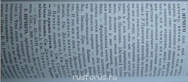 Марго! Морковкин рассматривает в "Объяснительном словаре" только структурные слова (местоимения, предлоги, союзы…), в том числе и предикативное местоимение "нечего1" со значеним = знач. "нет ничего, что бы". Приведённые им для этого значения слова "нечего" примеры далеки от рассматриваемого нами. Ну а далее… В конце статьи он упоминает и о существовании омонима у этого местоимения (не относящегося к структурным словам!):Марго:В Объяснительном словаре русского языка (под ред. Морковкина) НЕЧЕГО — предикативное местоимение