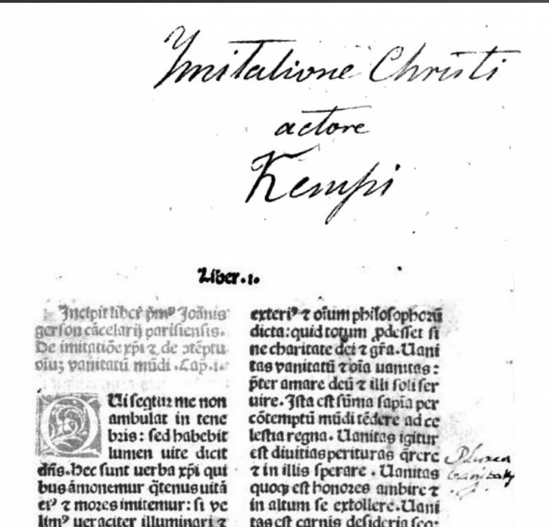Книга "Imitatio Christi", 1488, первая страница. В тексте ищите слова imitatione, imitentur и пр. Взято из гугл-книг. Отправлено спустя 28 минут 2 секунды: