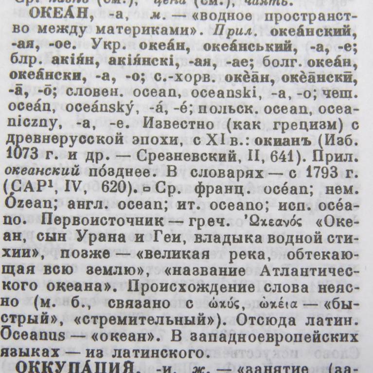 род. п. -а, народн. кия́н-море в сказках и заклинаниях (Даль), др.-русск., ст.-слав. океанъ ὠκεανός (Изб. Святосл. 1073 г., Иоанн Экз.; см. Срезн. II, 641). Из греч. ὠκεανός "море, океан" (Гомер, Гесиод); см. Фасмер, Гр.-сл. эт. 133; Преобр. I, 642.