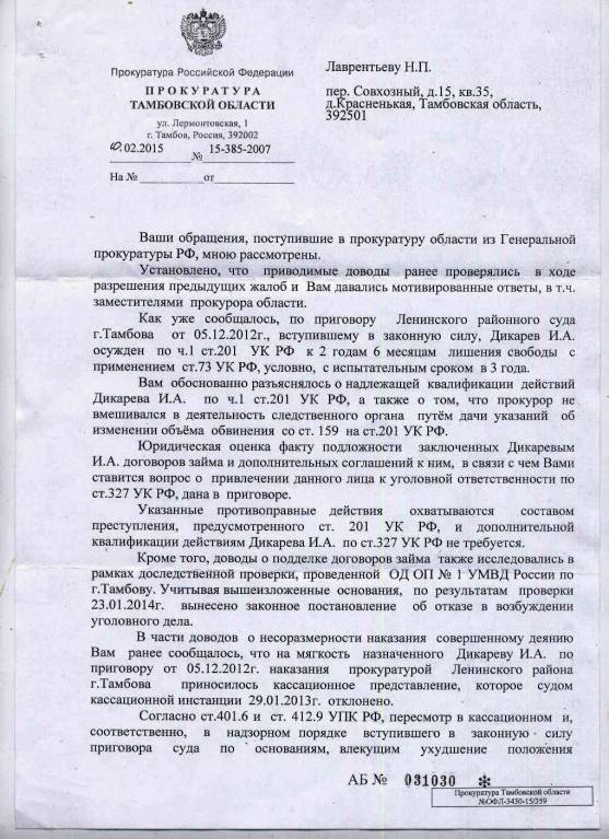 Торговченков В.И.: «Указанные противоправные действия охватываются составом преступления, предусмотренного ст. 201 УК РФ, и дополнительной квалификации действиям Дикарева И.А. по ст. 327 УК РФ не требуется. Кроме того, доводы о подделке договоров займа также исследовались в рамках до следственной проверки, проведённой ОД ОП № 1 УМВД России по г. Тамбову. Учитывая вышеизложенные основания, по результатам проверки 23.01.2014 г. вынесено законное постановление об отказе в возбуждении уголовного дела».