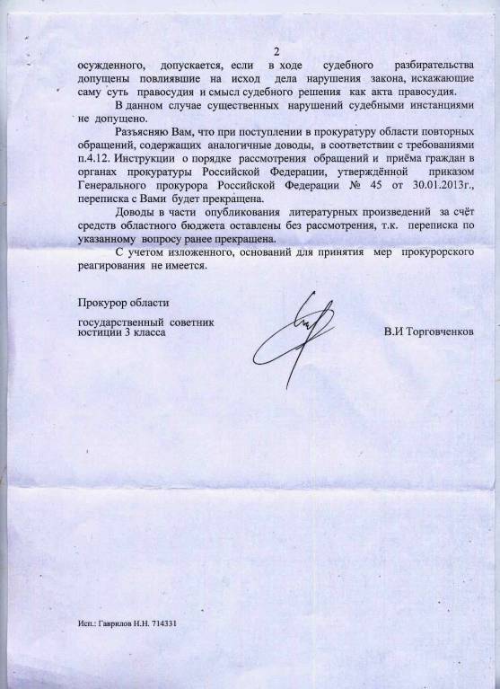 Если затрагиваю в жалобах прокуроров, то мои жалобы на них направляются им же, которые напоминают о прекращении переписки с ними или отвечают не по существу, как и все, притворяясь, что не понимают сути дела. Генеральная прокуратура пишет, что рассматривает жалобы лишь при условии, что если на такую же жалобу ответит прокурор Тамбовской области Торговченков В.И. Однажды мне удалось добиться от него ответа, но ничего не изменилось. Генеральная прокуратура РФ не рассмотрела жалобу даже тогда, когда я опроверг непроверенные повторения его предположений, а мои доводы, основанные на фактах и на документах, остались не опровергнутыми, их проигнорировали. По этой причине я вынужден повторять жалобы… Ответы не по существу и иных властных структур, которым, по-видимому, невыгодно менять законы в пользу народа согласно статье 3 Конституции России, провоцируют меня обратить Ваше внимание и на них.