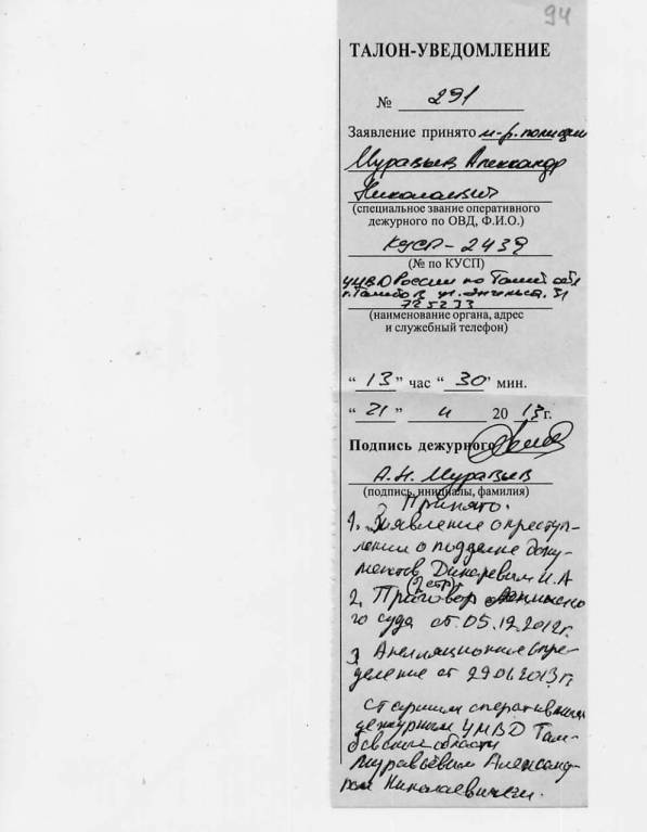 Чтобы опровергнуть эту ложь, я к своему заявлению 21.11.2013 г. в ОМ-1 полиции, и прилагал копии оригиналов приговора Ленинского суда от 05.12.2013 года и Определение Тамбовского областного суда от 29.01.2013 года. В обоих документах не было ни слова о том, что Дикарев И.А. наказан по статье 327 или что это его преступление по подделке подписей охватывается ч. 1 ст. 201 УК РФ. Ни ст. 327 УК РФ, ни ст. 292 УК РФ, никакая иная статья ответственности за подделку подписей или за подлог не упоминается в судебных документах.