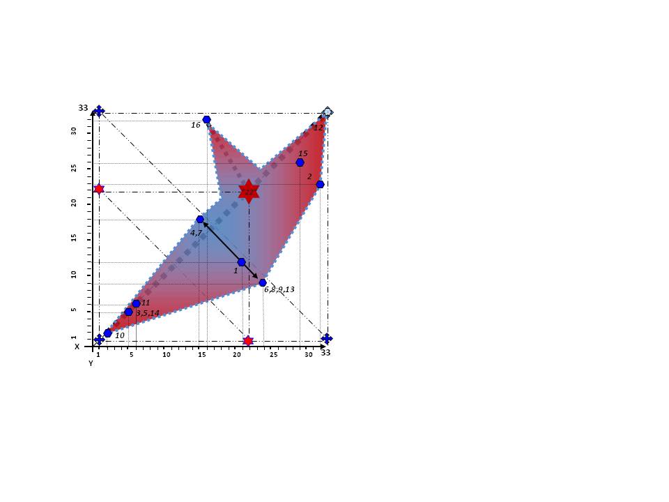 Обращаю внимание аудитории на то обстоятельство, что в данной схеме применён метод выхода за координатную плоскость: так точка «смайлик» расположена за пределами оси Х-33, а точнее в координатах Х-30|У-30. Почему и зачем так, спросит видящий эту картину, мыслящий читатель? По нескольким причинам, ищущий истины.