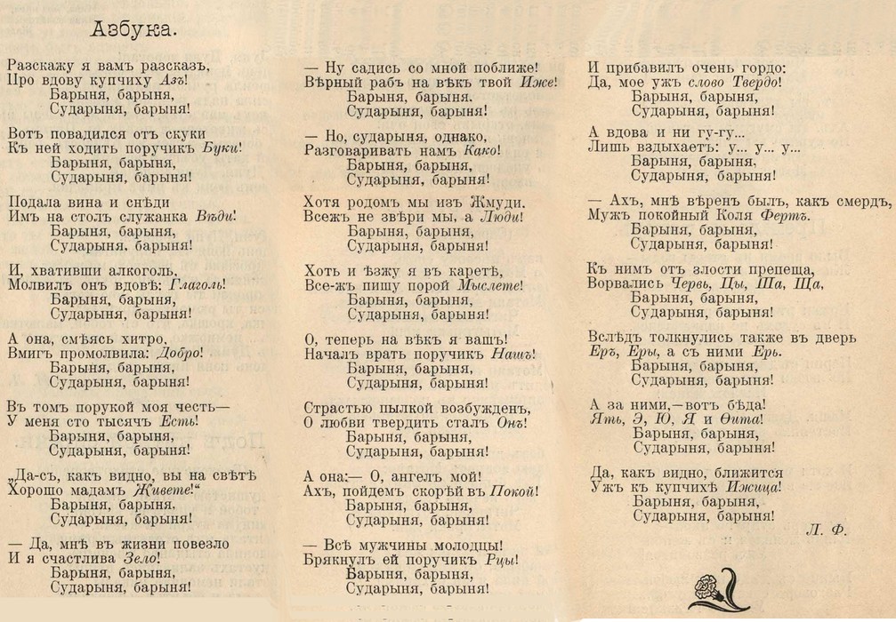 Азъ буки веде. Глаголъ добро есте. Живите зело, земля, и, иже како люди, мыслите нашъ онъ покои. Рцы слово твердо - укъ фъретъ херъ. Цы, черве, шта ъра юсъ яти!